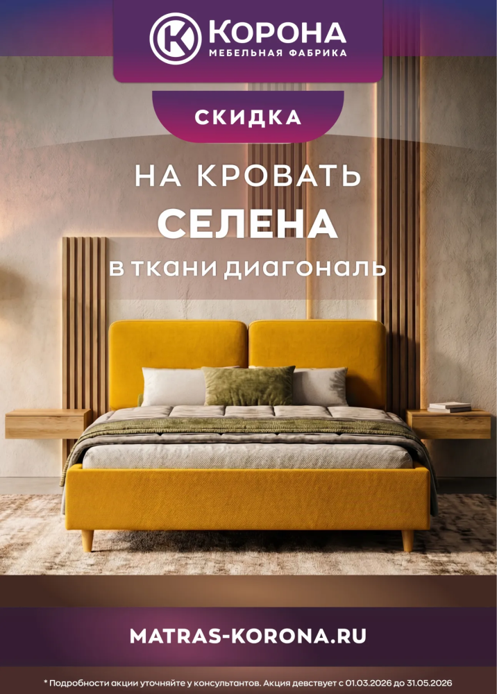 Подарок от фабрики! Скидка на кровать «Селена» в ткани «Диагональ». Размер скидки уточняйте у продавцов в фирменных салонах «Корона» (скидка зависит от модели и размера кровати).